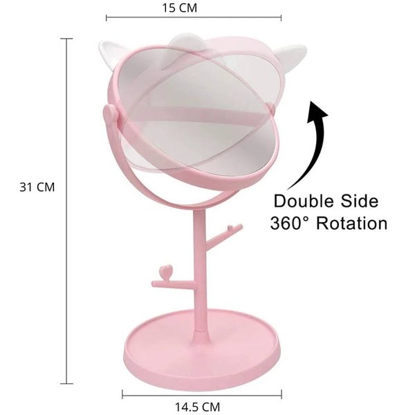 آینه و استند جواهرات گربه ای در رنگ‌های مختلف بفروش می‌رسد و دارای یک استند برای قرار دادن جواهرات و یا لوازم آرایشی است. همچنین دارای دو عدد شاخه برای آویزان کردن لوازم زینتی می‌باشد. جنس بدنه این آینه پلاستیک مقاوم است و آینه نیز قابلیت چرخش در زاویه دلخواهتان را دارد.