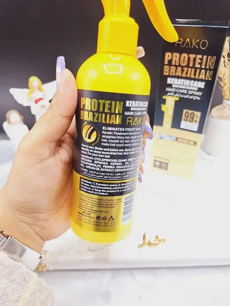 اسپری دو فاز کراتین و پروتین برزیلی حاوی روغن آرگان 99٪ راکو RAKO، کراتین، کلاژن و ترکیبات حرفه ای با خاصیت تقویت کنندگی و درمان فوری موهای آسیب دیده و ترمیم ساختار مو و تامین رطوبت مو میباشد. این محصول جهت درمان موهای خشک، رنگ شده و آسیب دیده و مراقبت مو به کار میرود و با داشتن مواد مغذی به عنوان ترمیم‌ کننده، نرم‌کننده و محافظت‌ کننده موهای رنگ شده شناخته شده میباشد،که نه تنها تاثیر مستقیم بر سلامت مو دارد؛ بلکه ظاهر موها را درخشان، شاداب و ابریشمی میکند،شانه کردن مو آسان ترمیشود و باعث رشد بهتر موها خواهد شد. نحوه استفاده از اسپری دوفاز مو راکو ؛ روزانه روی موهای تمیز اسپری کنید و بمالیدتاکاملا جذب شود-   _ابریشمی و زیبا کننده موها _تامین رطوبت مو و جلوگیری از ایجاد موخوره _درمان قطعی موهای آسیب دیده از رنگ،سشوار و غیره.. _بازسازی و افزایش رشد مو _نرم کننده وجلوگیری از شکنندگی مو _تقویت مو بعد از رنگ و دکلره _مغذی،لخت کننده و رفع وزی مو _ترکیبی ویتامینه برای ترمیم موه