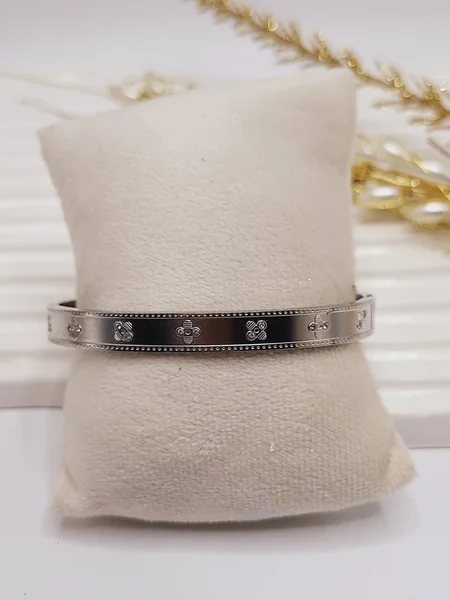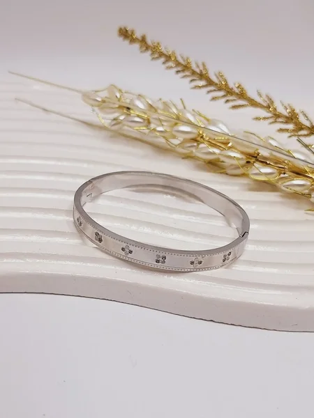این دستبند بنگال نقرهای نگین دار طرح گل استیل، همچون تابشی از ظرافت گلها بر روی مچ شما میدرخشد 🌸✨