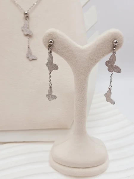 ست گوشواره و گردنبند طرح پروانه رنگ نقرهای از جنس استیل، محصولی شیک و زنانه برای تکمیل استایل روزانه و مجلسی است ✨💍