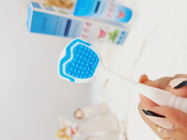 پس از مسواک زدن دندانها هنگام صبح و شب، مقداری از ژل خوشبو کننده را بر روی قسمت نرم سر براش قرار داده و به آرامی بر روی سطح زبان بکشید. حدود ۳ تا ۵ مرتبه براش را از قسمت انتهایی زبان به سمت نوک زبان بکشید. اکنون دهان خود را آبکشی کرده و براش را نیز با آب گرم بشویید.