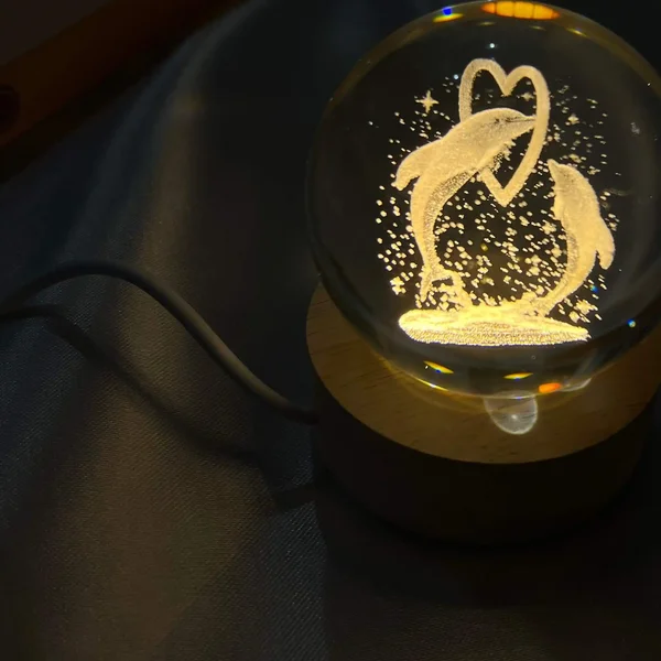 این چراغ خواب کریستالی به صورت سه بعدی و در طرح دلفین تولید شده که باعث جذابیت بیشتر اتاق خواب شما می شود. جنس این گوی شیشه ای از کریستال فشرده می باشد و همچنین دارای یک پایه چوبی و کابل برق USB می باشد که امکان اتصال به لپ تاپ، کامپیوتر، پاور بانک و شارژ گوشی را فراهم میسازد. این محصول دکوری منحصر به فرد و شیک و همچنین یک هدیه جذاب و ماندگار برای هر شخصی می تواند باشد.