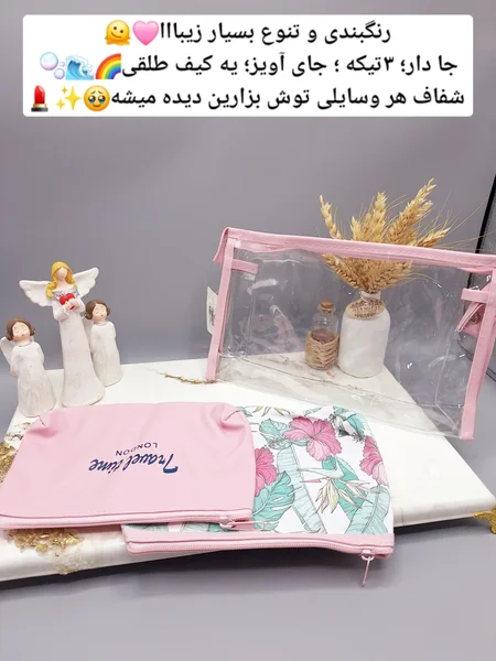 کیف آرایشی طرح برگ صحرایی این کیف فوق العاده خوشگل و جا دارهه🛍🎀🥹 همه وسایل هاتون داخل این ۳تا جا میشه🍓🧸 و خوبی که داره سایز بزرگ این کیف طلقی شفاف هست همه وسایل جینگول تون رو نشون میده ⛄️ کیفیت اش وارداتی هست🌈 بسته بندی بسیار شیکی دارههه✨ ساده از کنارش نگذر😌 ۳ تیکه در 4 رنگ زیباااا کیفیت عالی قابل شستشو مقرون به صرفه بسیار کاربردی