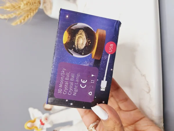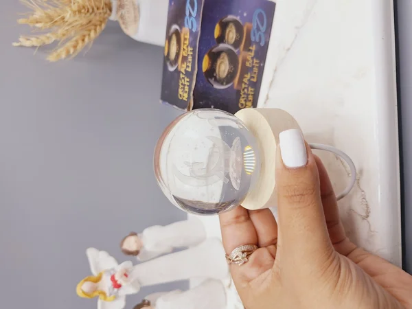 گوی کریستالی چراغدار با پایه چوبی (مناسب چراغ خواب) ارسال طرح رندم که مردم آنرا با نام گوی کهکشانی نیز می شناسند یک دکوری مدرن و جذاب رومیزی است. در قسمت پایه دارای ال ای دی است که با نور ملایمی کره کریستالی را روشن می‌کند و زیبایی طرح درون کره کریستالی را چند برابر میکند. این کره کریستالی زیبا میتواند به عنوان یک  چراع خواب نیز خرید و استفاده شود. کره کریستالی یک گوی کاملا شفاف کریستالی نسبتا سنگین است که با کیفیت بالایی به صورت کره درآمده. این کره کریستالی درون خود طرح فضانوردی را  دارد که با یک نزدبان فانتزی به سوی ماه می رود. همیشه ماه و طرحهای مرتبط به آن برای انسان جذابیت دارند. طرح  فضانورد یک طرح رویایی فانتزی فوق العادست و حس رفتن به آسمان و رهایی را می دهد. این طرح بدون روشن شدن چراغ نیز قابل مشاهده است اما با روشن شدن چراغ زیبایی آن دو چندان می شود و زیبایی آن در محیط تاریک چند برابر می شود. البته همانطور که گفته شد حتی بدون روشن شدن چراغ نیز طرح زیبای درون ان مشخص است و میتواند میز کار، کتابخانه یا دکور شما را زیبا کند. توان لامپ ال ای دی این کره‌ها شفاف شیشه‌ای که درون پایه چوبی آن قرار دارد با کابل USB که به آن متصل است تامین می شود. این کابل را به انواع دستگاه‌های که پورت USB دارند می‌توانید متصل کنید. از چند راهی های USB دار  و کامپیوتر و لپتاپ تا گیرنده لپتاپ و شارژر موبایل و …  . به خاطر همین نور گوی کریستالی را میتوان یک چراغ خواب زیبا نیز دانست.